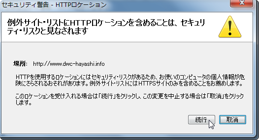 セキュリティの警告が出るが、「続行」ボタンを押す。
