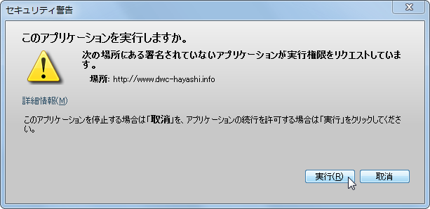 その後、サンプルアプレットを開くと再度「セキュリティの警告」が表示されるが、「実行」ボタンをクリックする。