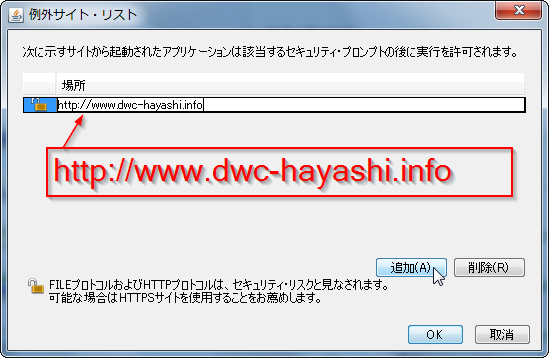「場所」のテキストボックスに「http://www.dwc-hayashi.info」と入力し、「追加」ボタンを押す。