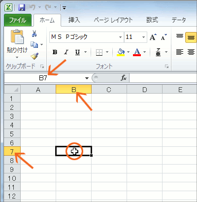 B7番地のセルの真ん中にマウスポインタを合わせると、左の図のような白い十字のマウスポインタの形になります。 この状態でクリックすると、B7番地が太枠で囲まれます。 今、B7番地に何か操作を行える状態ですよ~という意味なんですが、B7番地ということが分かりやすいように、B列の列番号、7行目の行番号の色が変わっていることが分かります。 そしてA列の列番号の上の部分に、「B7」という風に、現在操作を行える状態のセル番地が表示されています。 この部分のことを「名前ボックス」と呼びます。 |