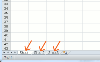 今度は画面の左下を見てみましょう。 「Sheet1」「Sheet2」「Sheet3」という見出しがあります。 これを「シート見出し」と言うのですが、この超デカいワークシートは既定で最初は3枚1セットになっています。 このシート見出しをクリックすることで、各ワークシートに切り替えることができます。