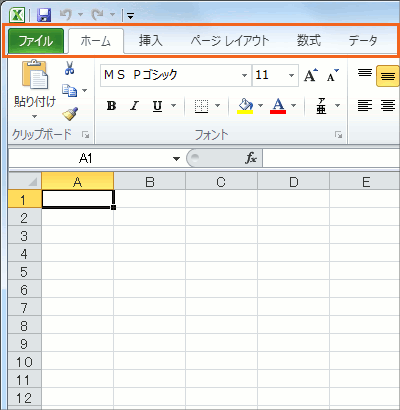 このようにボタンの分類を切り替える部分のことを「タブ」と言います。 Excel 2010ではタブの一番左端が緑色の[ファイル]タブというものになっています。 このタブはちょっと特別なタブです。 [ファイル]タブをクリックすることで、このような普段とは違う画面に切り替わります。 この画面のことをBackstageビューと言います。