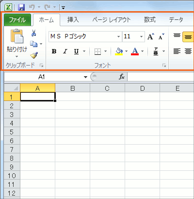 タブと、タブをクリックすることで切り替わる、ボタンが収納されている部分を総称して「リボン」と呼びます。 |