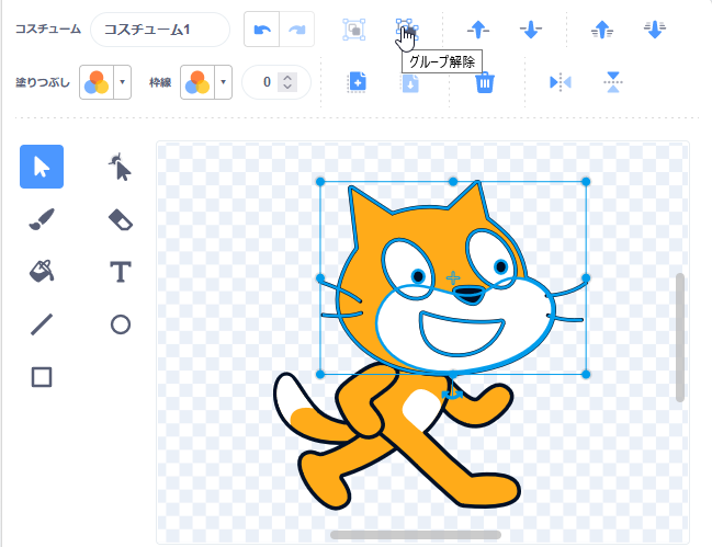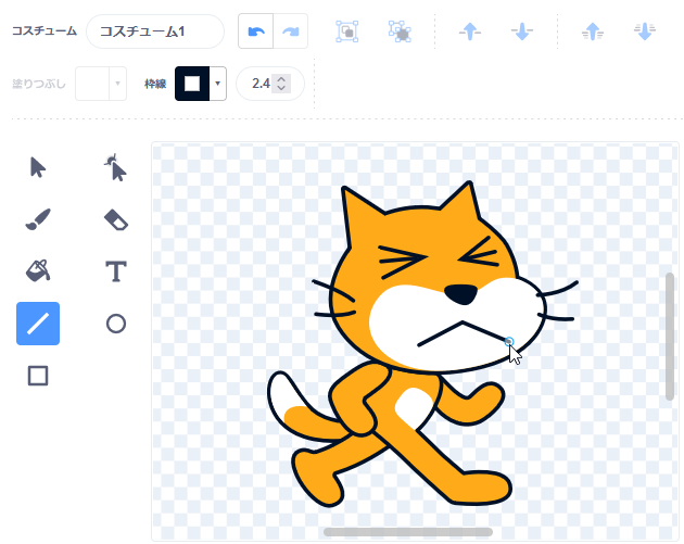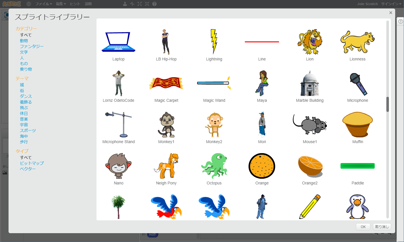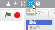 下図のアイコンをクリックしてライブラリを開いてスプライトを選びます。