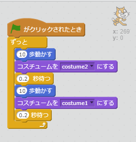 スクリプトの入門として、スクラッチキャットに次のようなスクリプトを書いてみましょう。