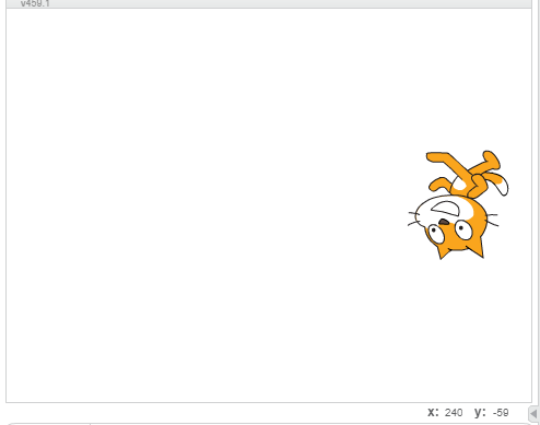 この状態で緑の旗をクリックしてからマウススプライトをドラッグすると、ドラッグしたマウスに向かってスクラッチキャットが追っかけてきます。