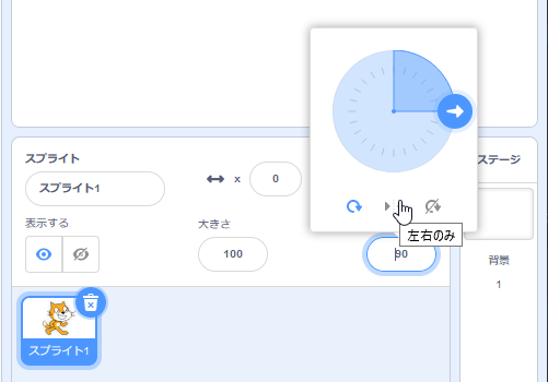 【動き】の中に〔…へ向ける〕ブロックがあるので、これを使ってみます。