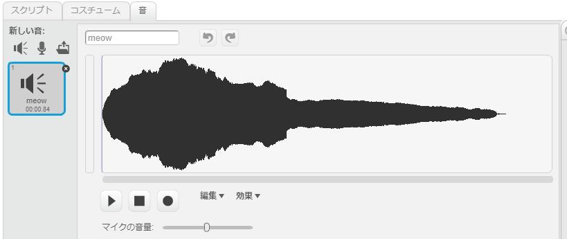 音タブを選択するとスプライトが持つ音が波形として表示されます。