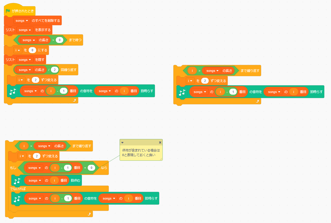 まず、データのルールを決める。音符と拍数のそれぞれのリストを作り、順番に読み出すこととする。
