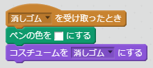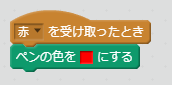 - 鉛筆のスプライトを選択し、イベントグループの「メッセージを受け取ったとき」をドラッグし、メッセージに応じたペンの色を設定