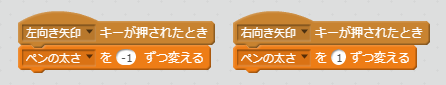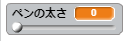 - 描画のスクリプトに、ペンの太さを変更するブロックを付け加え、変数名からドラッグしてはめ込みます