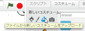 - 新しいコスチュームから「ファイルから新しいコスチュームをアップロード」をクリックし、先ほどの消しゴムのイラストを選択する
