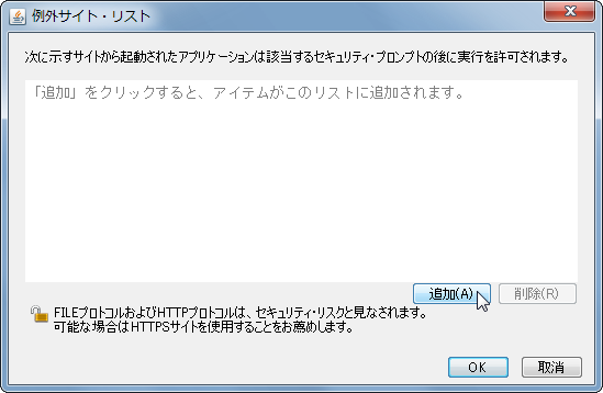 「場所」のテキストボックスに「http://www.dwc-hayashi.info」と入力し、「追加」ボタンを押す。