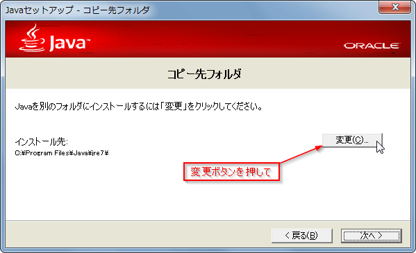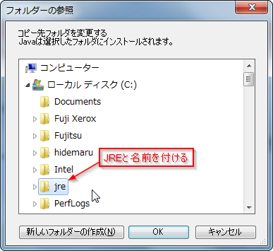「新しいフォルダーの作成」ボタンを押し、そのフォルダに「jre」(半角)と名前を付け、「OK」ボタンを押す。